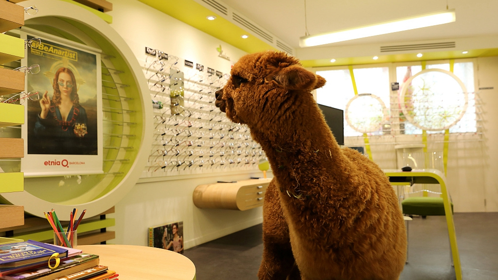 Attracted by goods placed in the shop, the alpaca went into the optician's office when the automatic doors slid open. As the "window-shopping" began, the curious animal also checked itself out in the mirrors. /VCG Photo