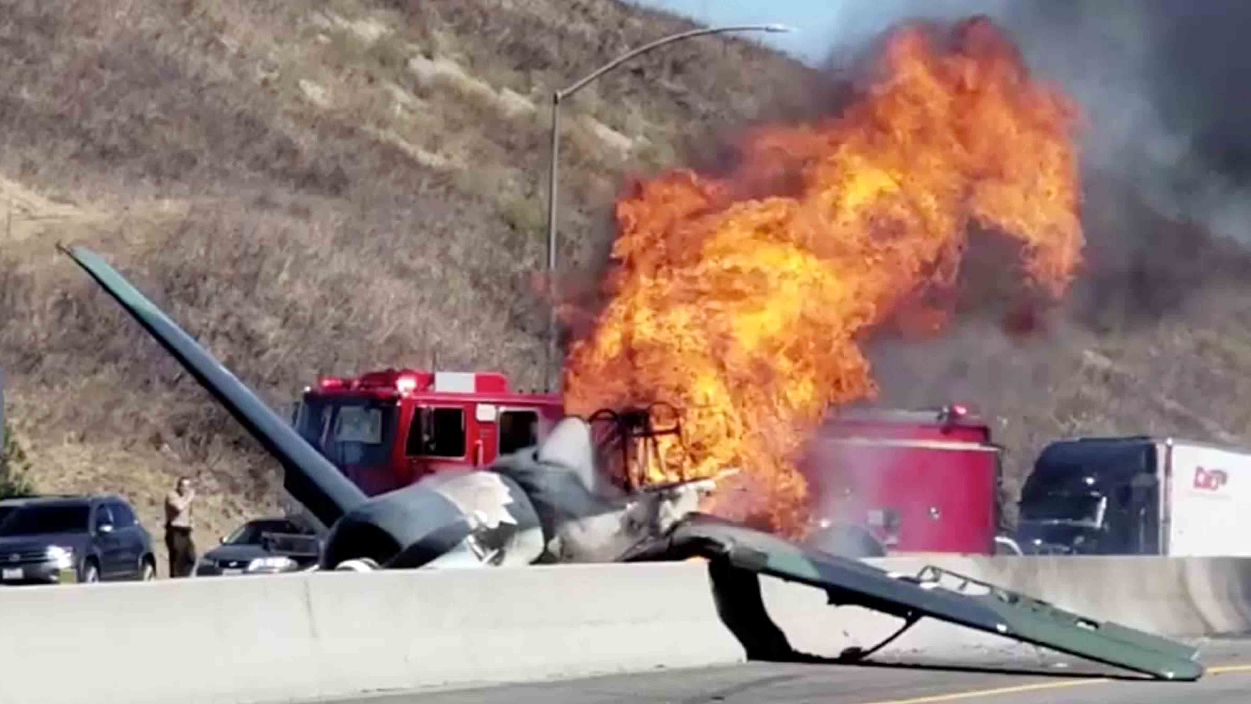A small vintage plane burst into flames in the middle of the 101 Freeway in Agoura Hills of California on Tuesday, bringing traffic to a standstill. The pilot was safely removed, and there was no damage to the surrounding vehicles.