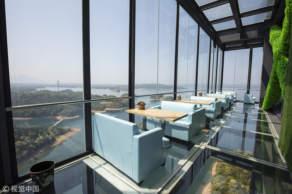 It is one story to step out on transparent floor shortly but do you have the nerve to have a laid-back drink knowing that you are at a vertical drop of 99 meters? /VCG Photo