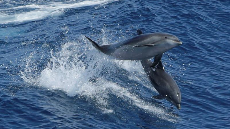 A pair of dolphins leaped in the wake of Royal Caribbean cruise line ship 'Grandeur of the Seas' July 18, 2013 in the Atlantic Ocean between Bermuda and the US main land. /Reuters Photo
