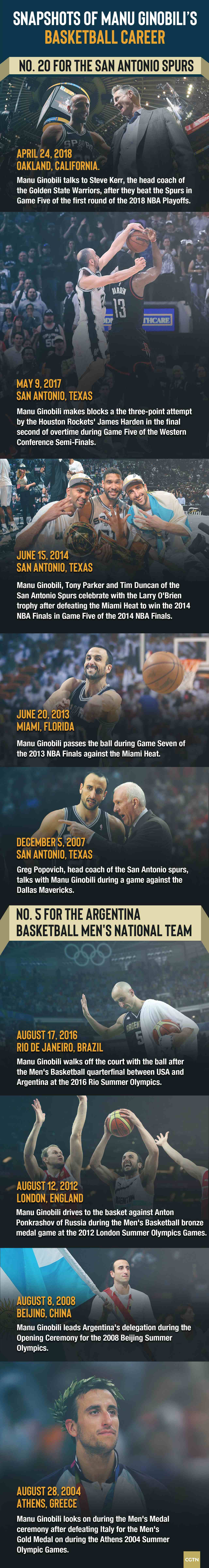 Argentinian Manu Ginobili was crowned four NBA championship titles during 16 seasons with the San Antonio Spurs, and won MVP and a gold medal at the 2004 Athens Summer Olympic Games as captain of the men's basketball team from Argentina.