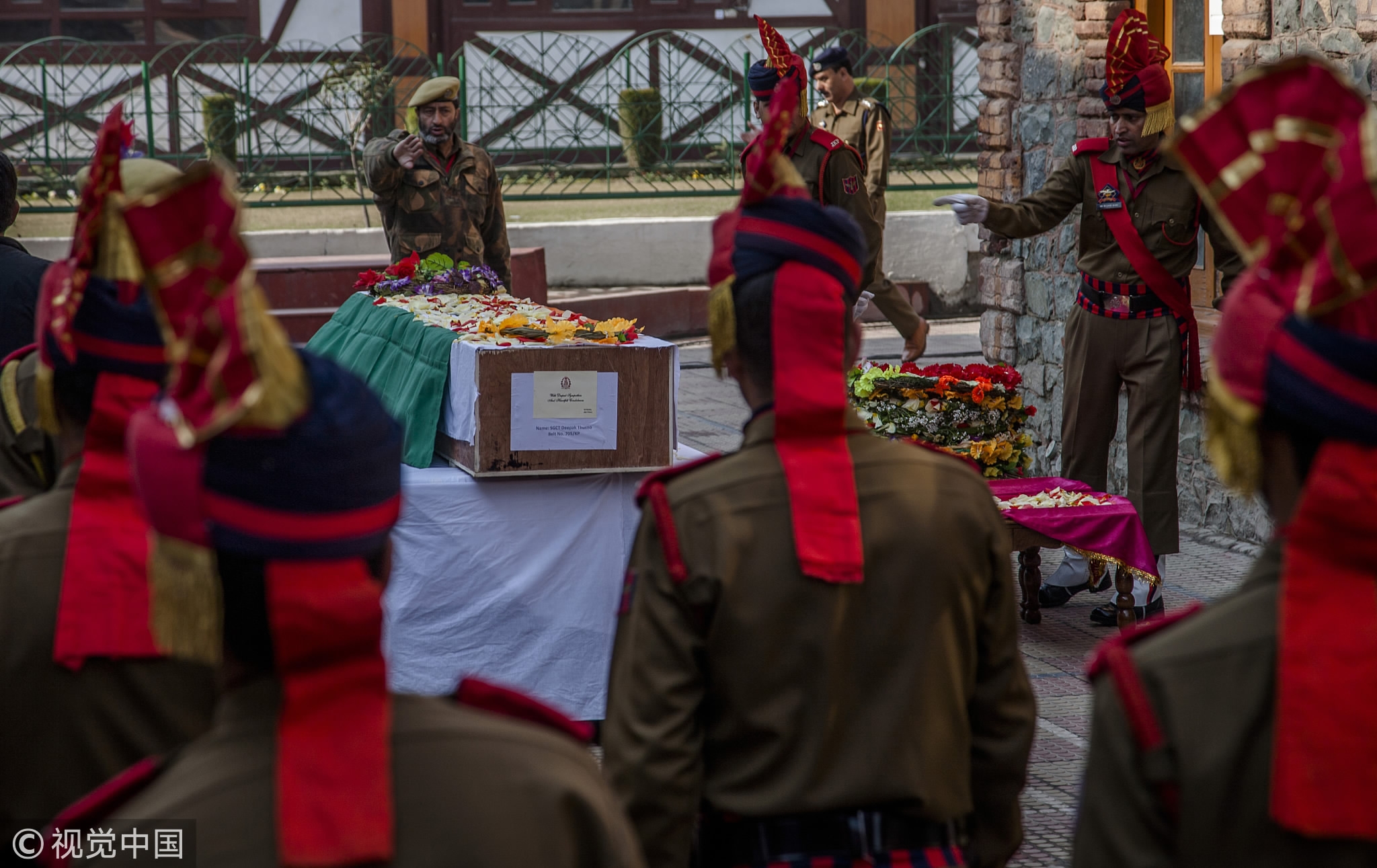 Honor guards of Indian police stand in formation as they honor the coffin containing the body of their comrade, Deepak Thusoo, killed in a gun battle with suspected rebels, during his wreath laying ceremony at a police headquarters, on March 21, 2018, in Srinagar, the summer capital of Indian administered Kashmir. /VCG Photo
