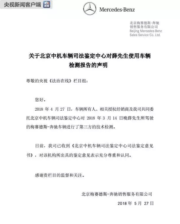 Mercedes-Benz also released a statement concerning the report by the China Vehicle Forensic Center in Beijing on Sunday, expressing their support for the tests results.
