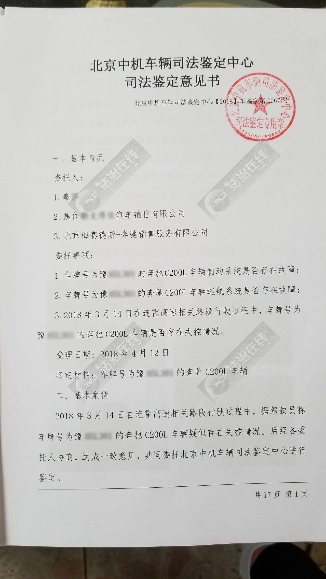 A judicial expertise result showed that there was no defect in the brake and cruising systems of a Mercedes-Benz vehicle which was described as going out-of-control by its driver Mr. Xue on March 14, 2018.