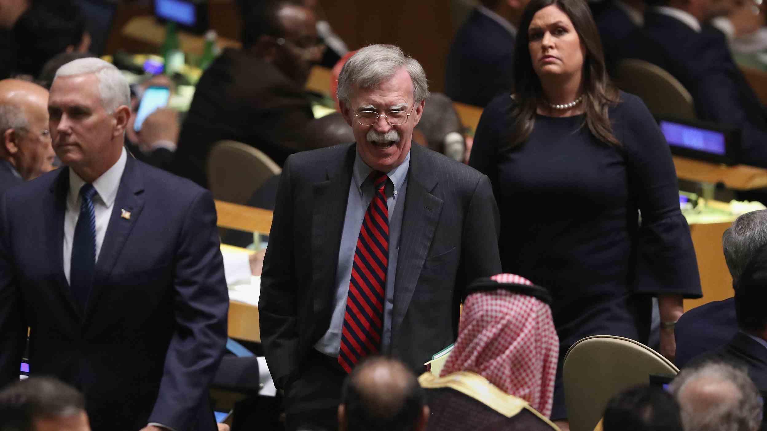 US National Security adviser John Bolton (C) greets a member of the Saudi Arabian delegation as he arrives with US vice president Mike Pence (L) and White House press secretary Sarah Huckabee Sanders at the UN General Assembly, New York, September 25, 2018. /VCG Photo