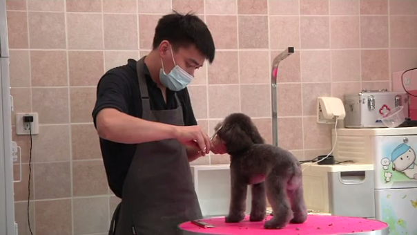 A dog having meticulous grooming service in a pet store./ CGTN Photo