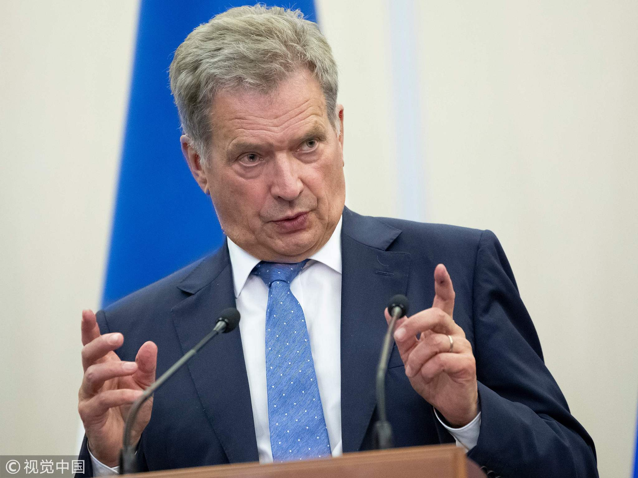 Finnish President Sauli Niinisto gestures while speaking during a joint news conference with Russian President Vladimir Putin following their meeting at the Bocharov Ruchei residence, August 22, 2018. /VCG Photo