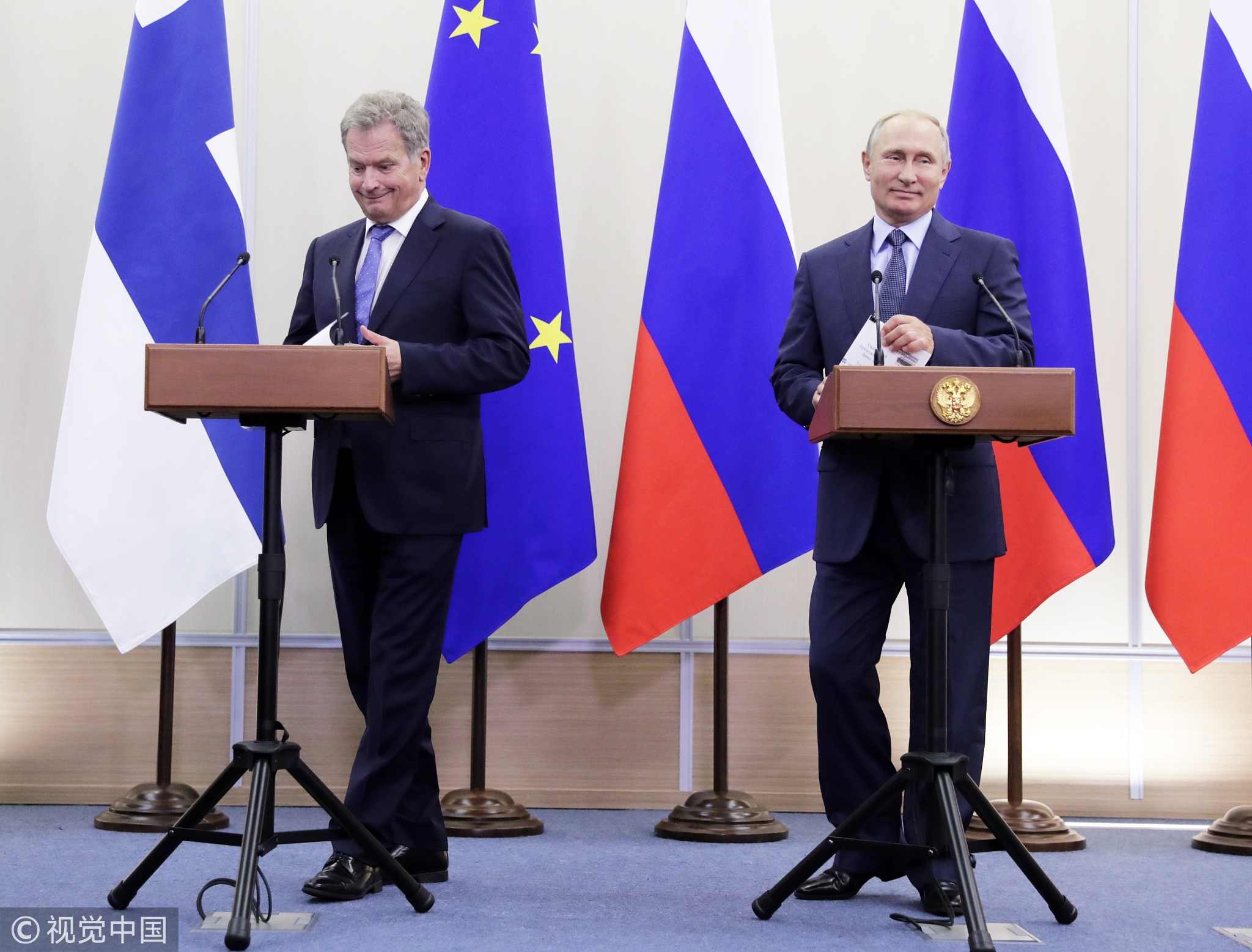 Finnish President Sauli Niinisto and Russian President Vladimir Putin during a joint press conference following their meeting at the Bocharov Ruchei residence, August 22, 2018. /VCG Photo