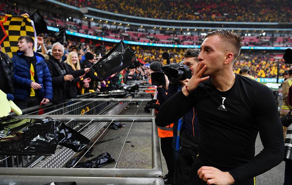 Gerard Deulofeu (R) celebrates with fans after the FA Cup semifinal win against Watford at Wembley Stadium on April 7, 2019. /VCG Photo