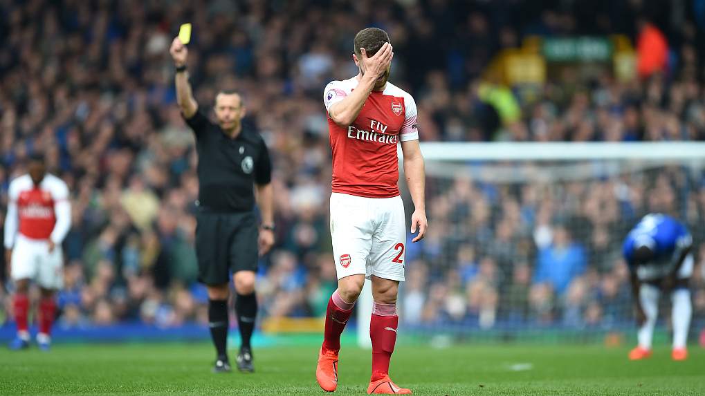 Everton's Phil Jagielka (C) beats Arsenal goalkeeper Bernd Leno with a right footed shot from close range during their clash on April 7, 2019. /VCG Photo