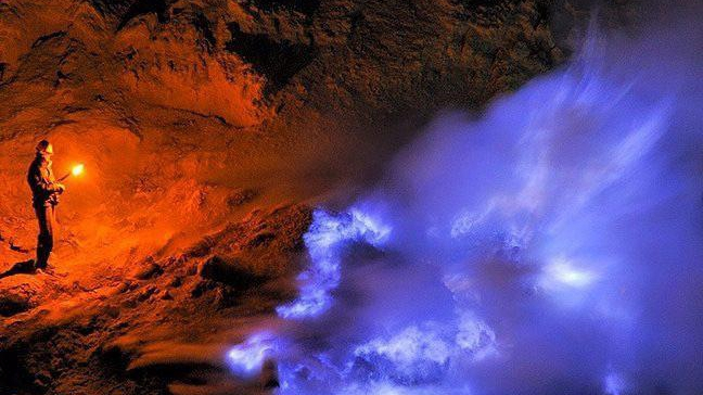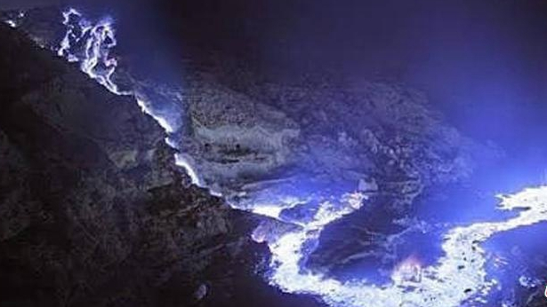 The blue flames are not actually lava. The blue glow comes from high levels of sulphuric gas in the volcano. When the gas is exposed to oxygen in the air and burned by the lava, it emits a blue light. /VCG Photo