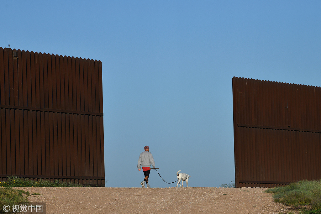 Man walks dog past a stretch of border fence in south Texas, U.S.