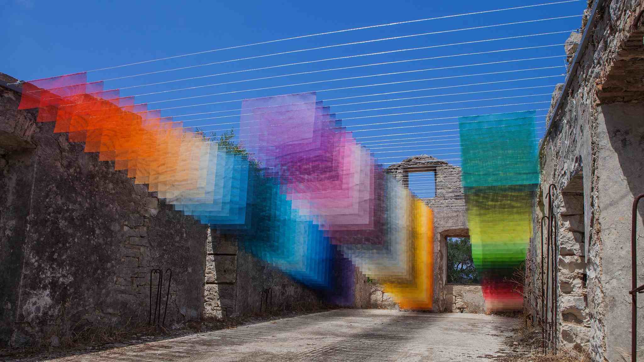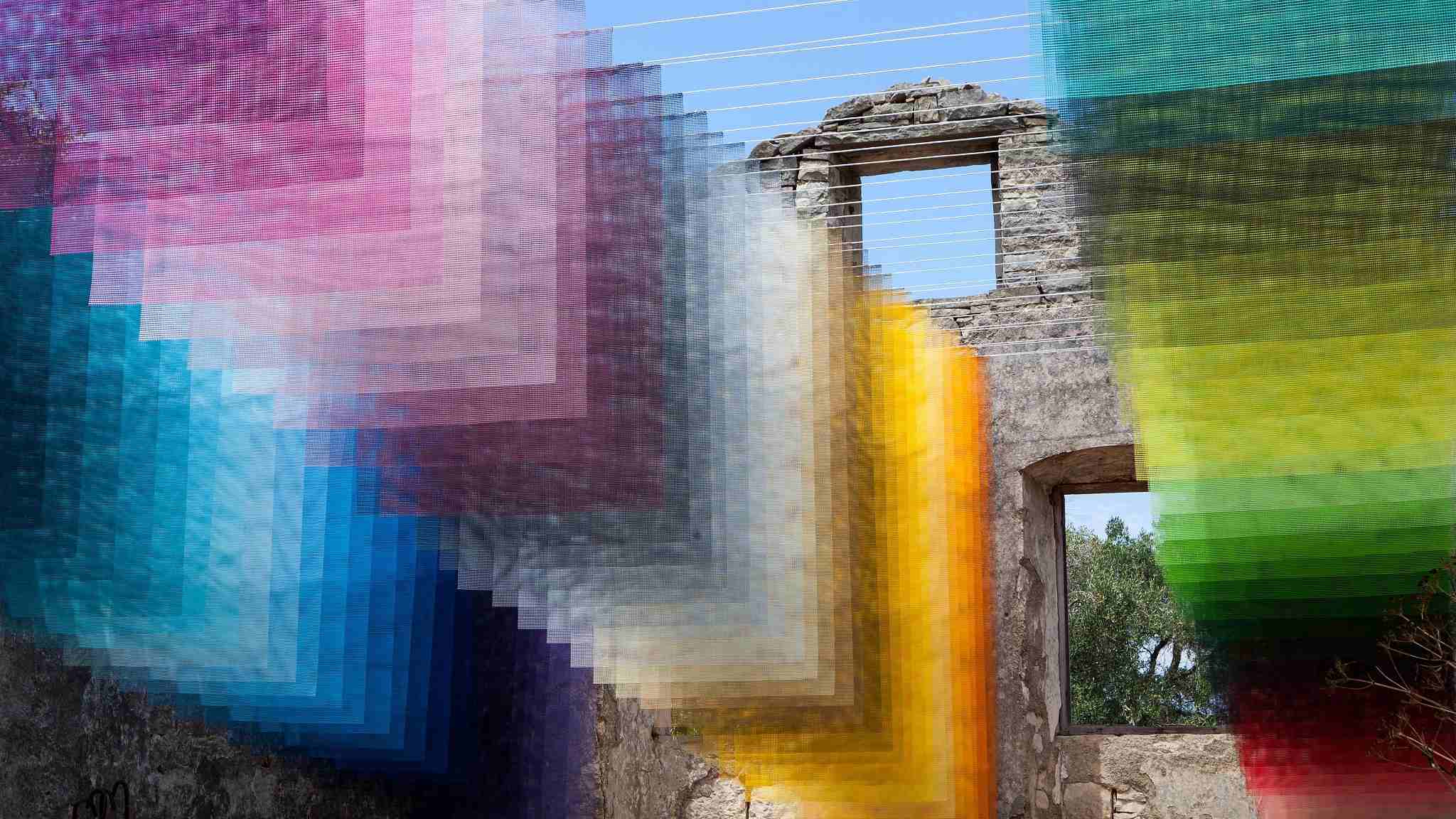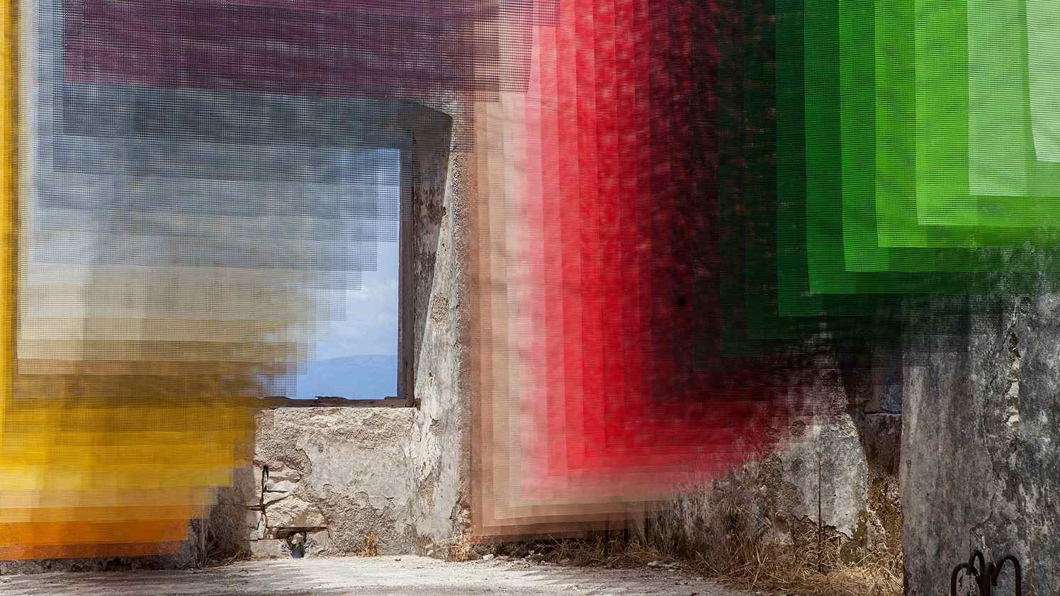 German artists transformed a derelict stone building on the Greek island of Paxi with layers of spray-painted mesh-like fabric, creating a colorful mirage that resembles a pixellated image. /VCG Photo