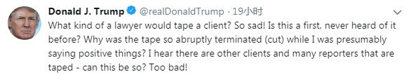 On Wednesday, a seething Trump lashed out, tweeting: "What kind of a lawyer would tape a client? So sad! Is this a first, never heard of it before?"