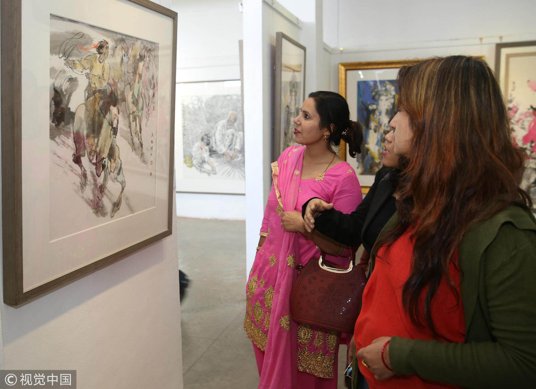 Local visitors watch paintings on display at the exhibition featuring modern Chinese water-ink paintings in Nepal. /VCG Photo