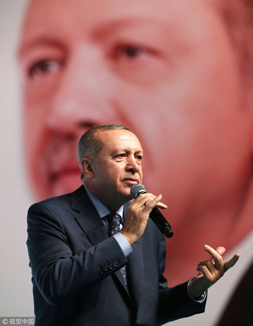 Turkish President Recep Tayyip Erdogan delivers a speech during the ruling Justice and Development (AK) Party's Istanbul women's branch congress, April 28, 2018. /VCG Photo