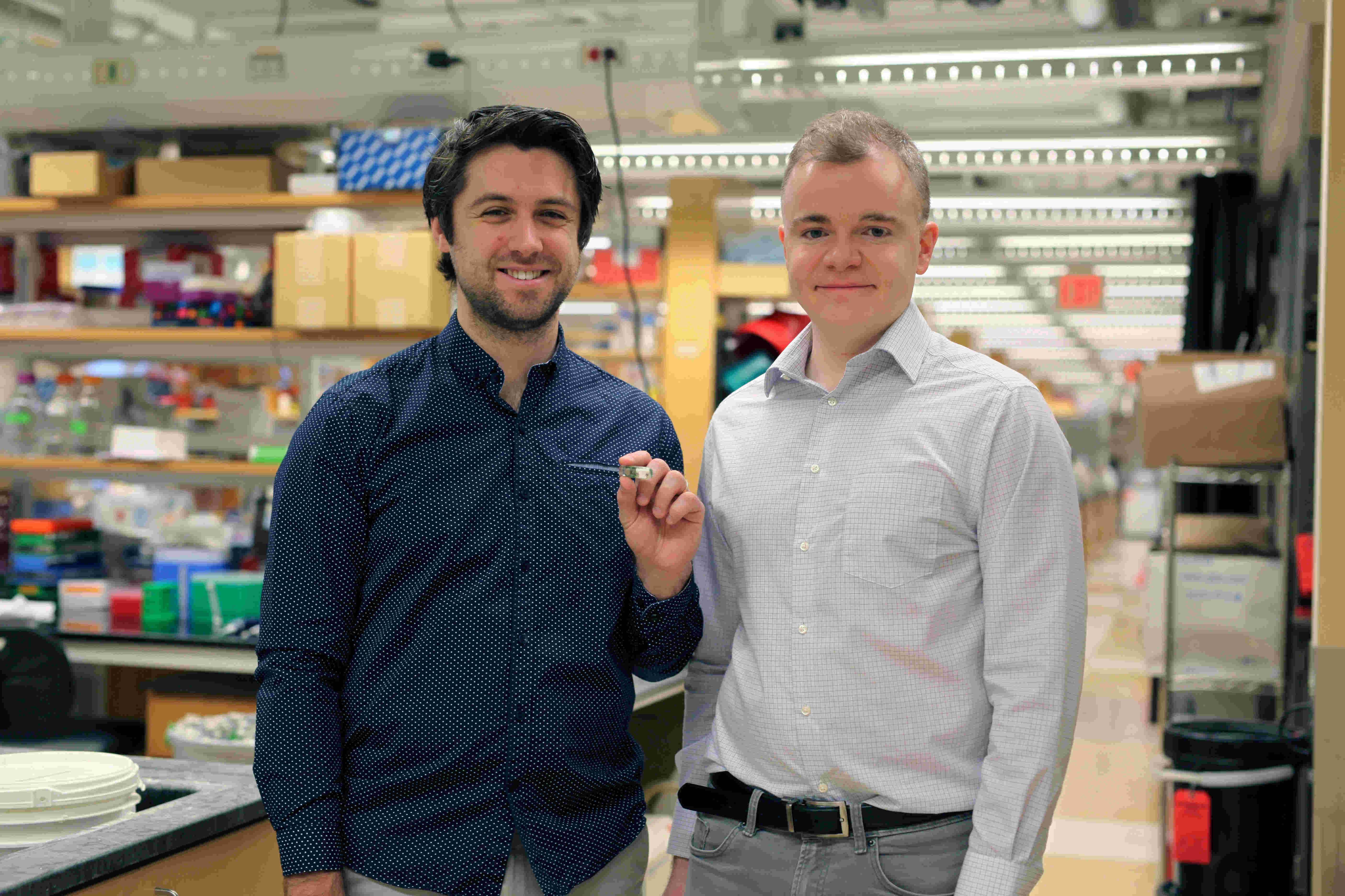 Graduate student Mark Mimee (L) and former MIT postdoc Phillip Nadeau pose with the ingestible sensor. /MIT Photo