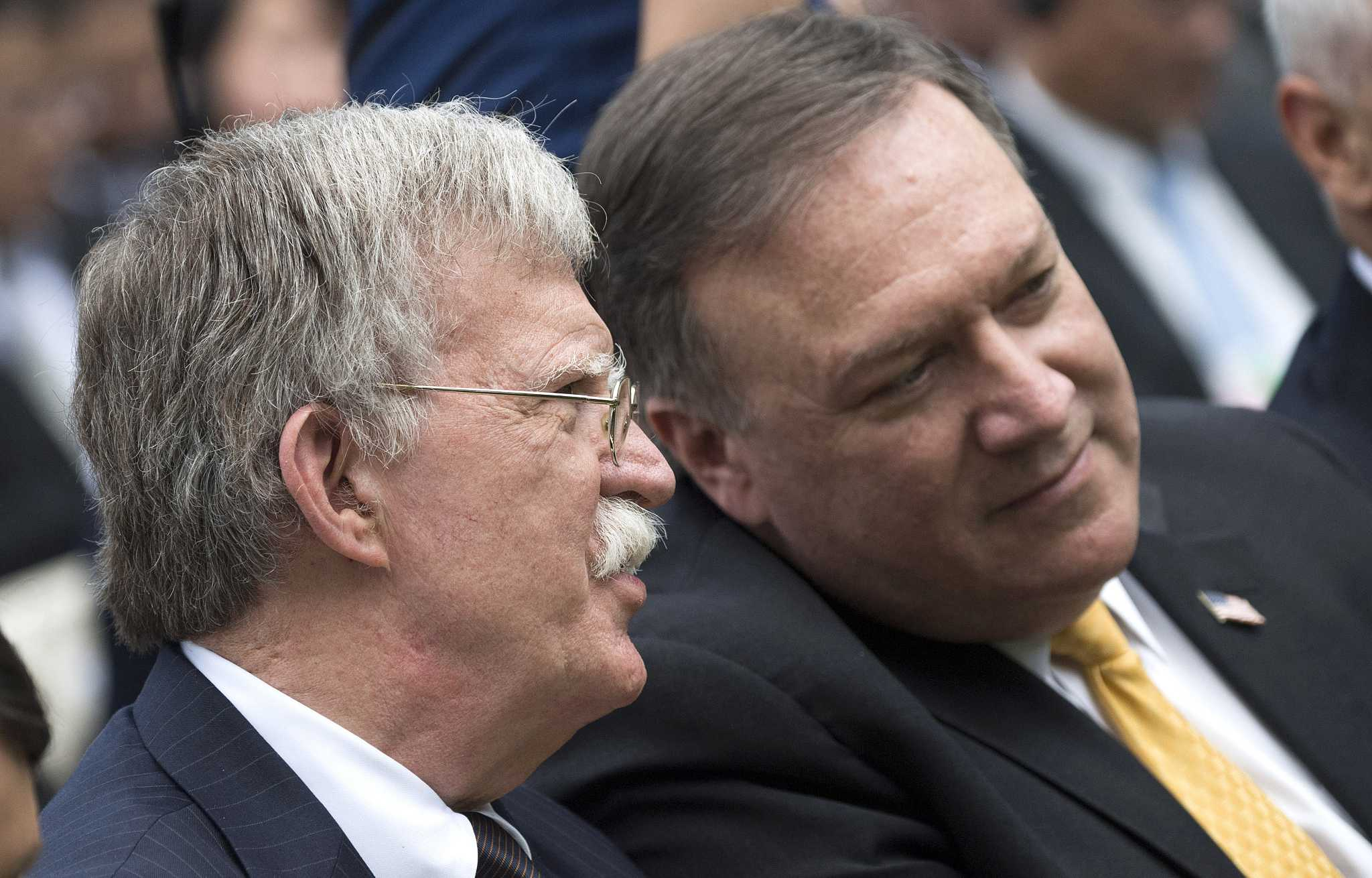 US National Security Adviser John Bolton (L) and Secretary of State Mike Pompeo talk prior to a joint press conference between President Donald Trump and Japanese Prime Minister Shinzo Abe, at the White House in Washington, DC, June 7, 2018. /VCG Photo