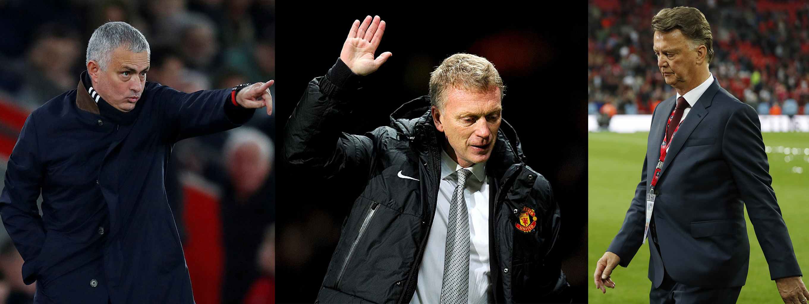 Three managers of Manchester United after Sir Alex Ferguson: Jose Mourinho (L), David Moyes (C) and Louis van Gaal (R) /VCG Photo
