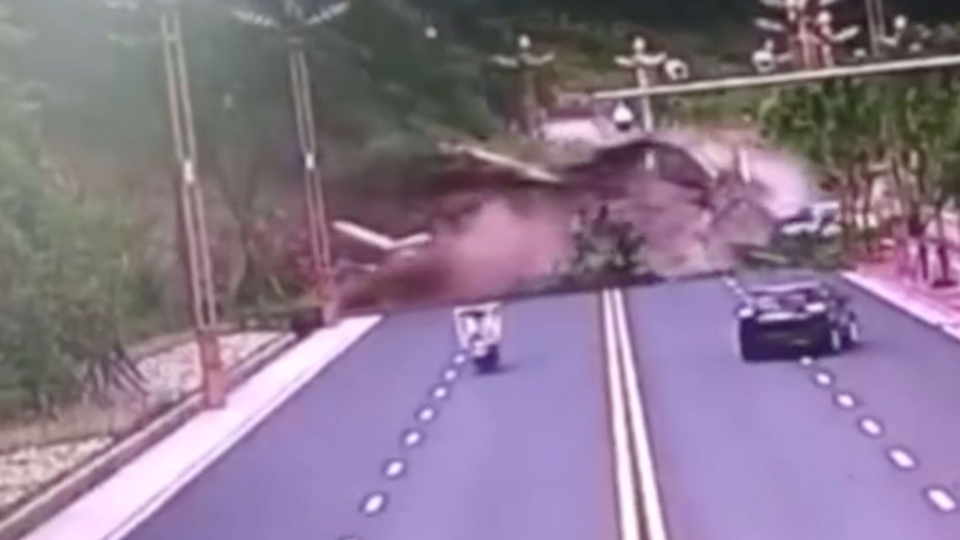 A mountainside collapsed onto a road, burying a truck and two e-scooters in Ya'an City, southwest China's Sichuan Province, on Aug. 6. At least one person was injured, says a local TV station.