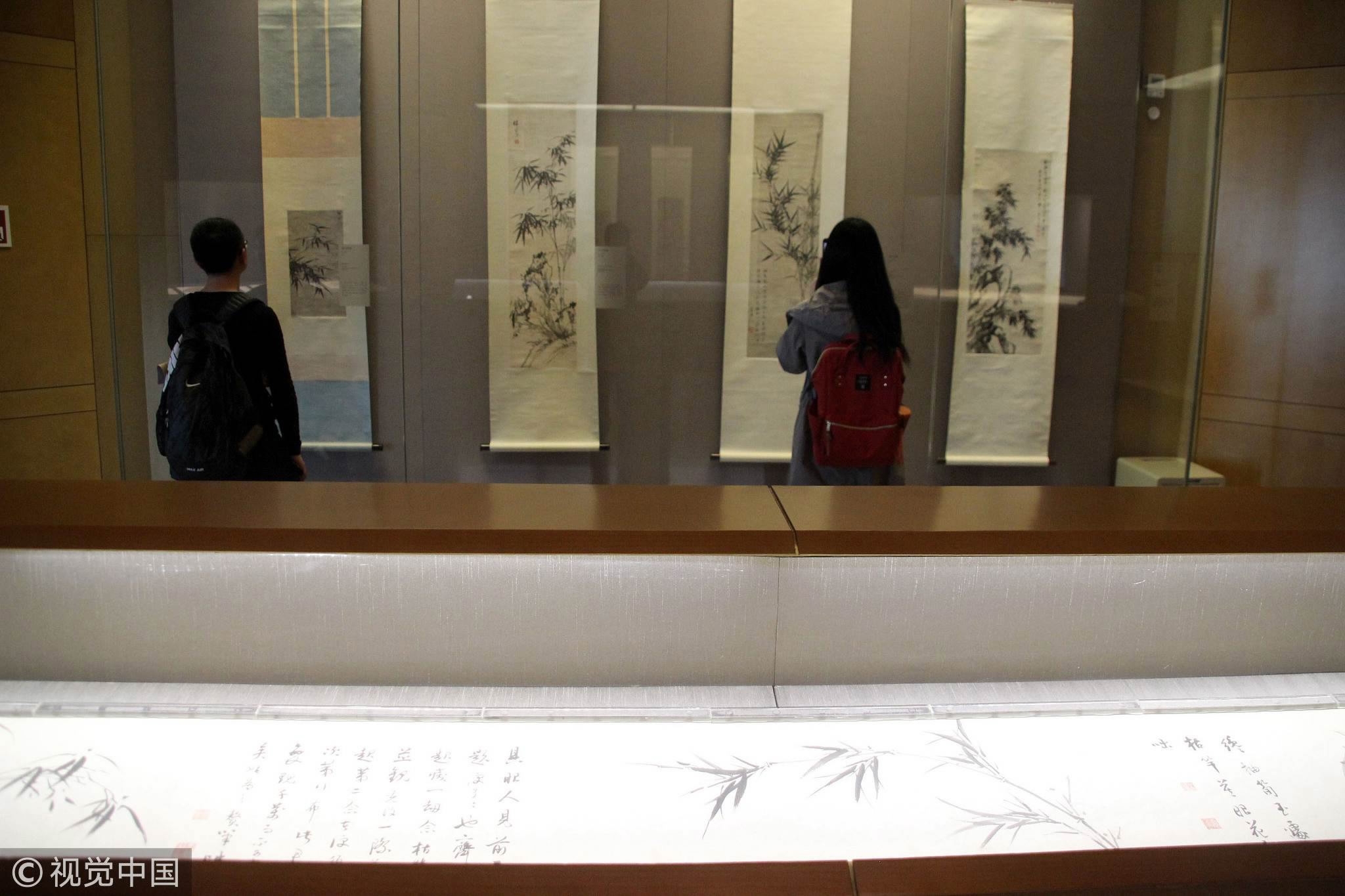 A visitor views Chinese paintings on display at Suzhou Museum. /VCG Photo