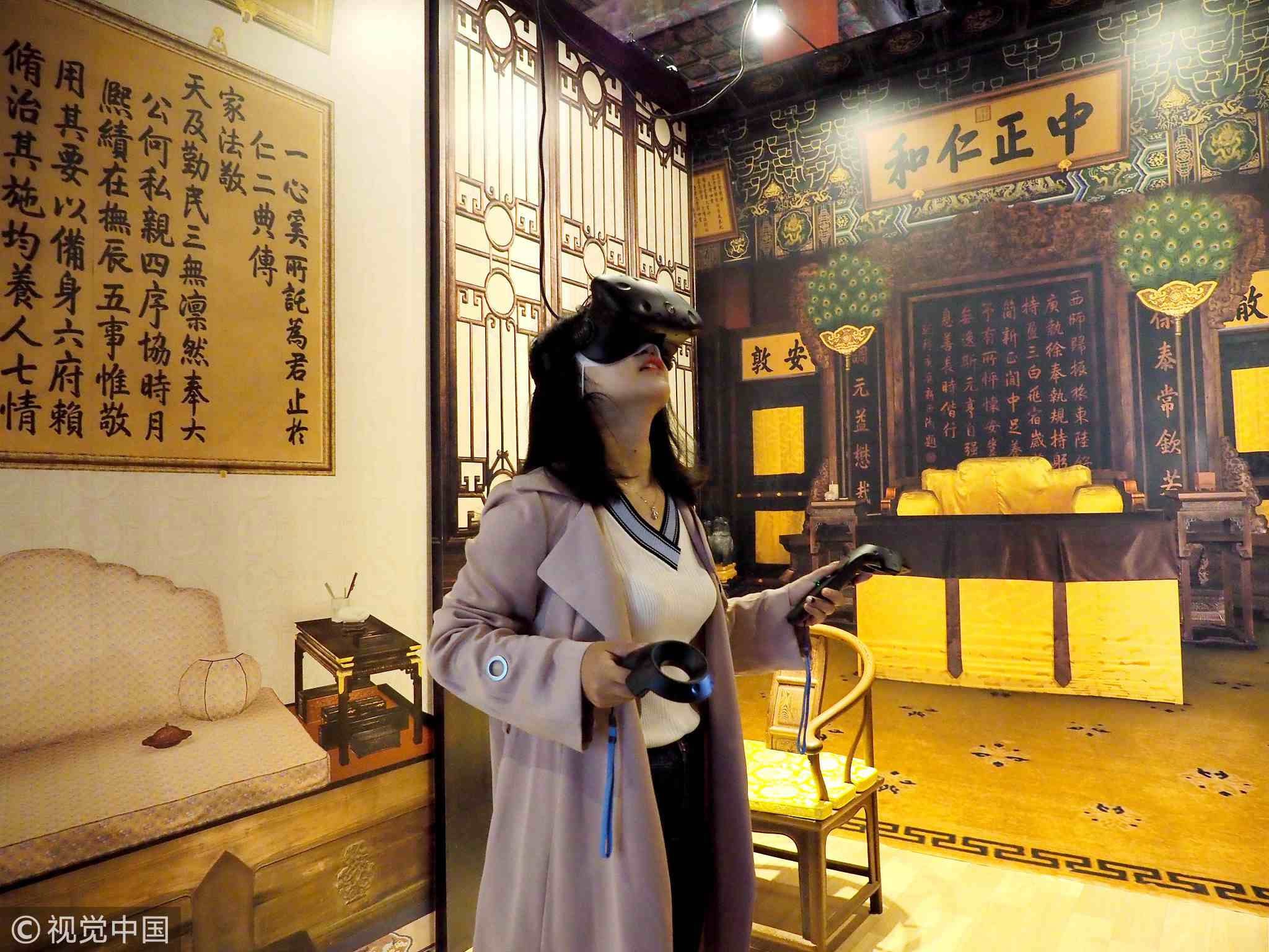 A visitor wearing VR headset while watching an exhibition at the Palace Museum. /VCG Photo