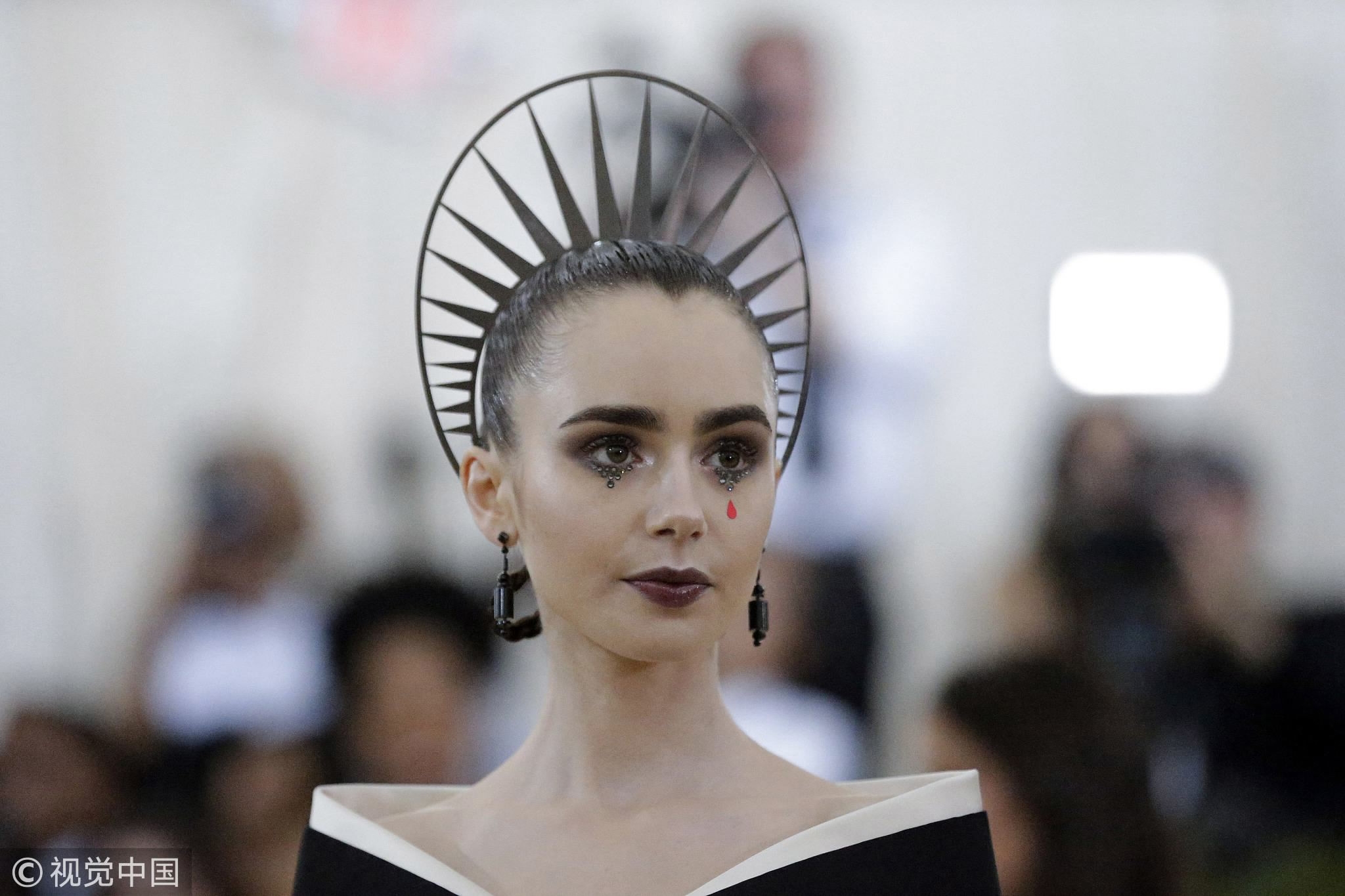 Lily Collins arrives on the red carpet at The Metropolitan Museum of Art's Costume Institute Benefit "Heavenly Bodies: Fashion and the Catholic Imagination" at Metropolitan Museum of Art in New York City on May 7. /VCG Photo