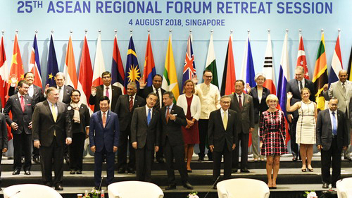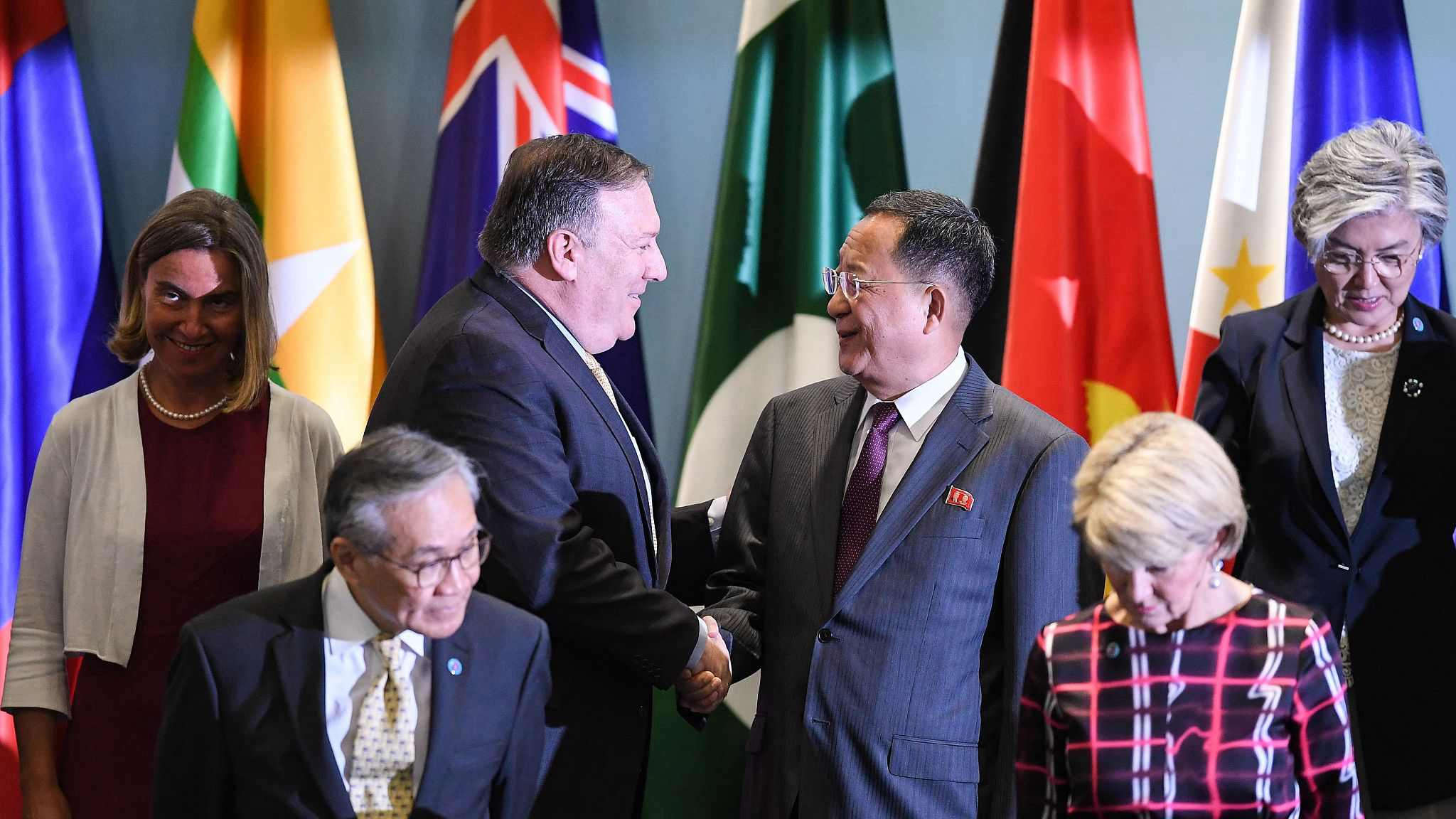 Ri and US Secretary of State Mike Pompeo shook hands and exchanged words and smiles during a group photo session at the forum.