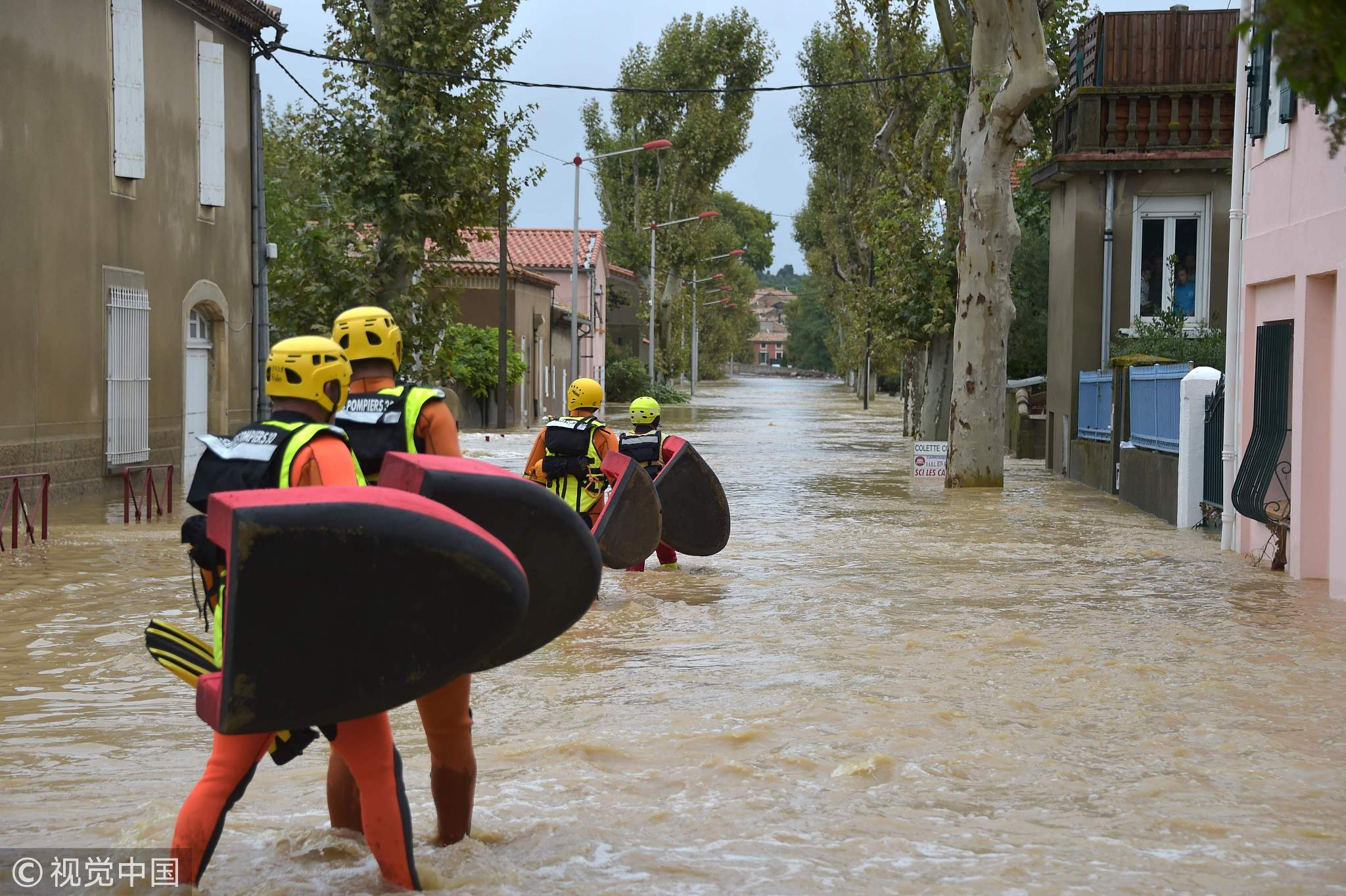 Firefighters walk in a flooded street during a rescue operation following heavy rains that saw rivers bursting banks, October 15, 2018, in Trebes, near Carcassone, southern France./ VCG Photo
