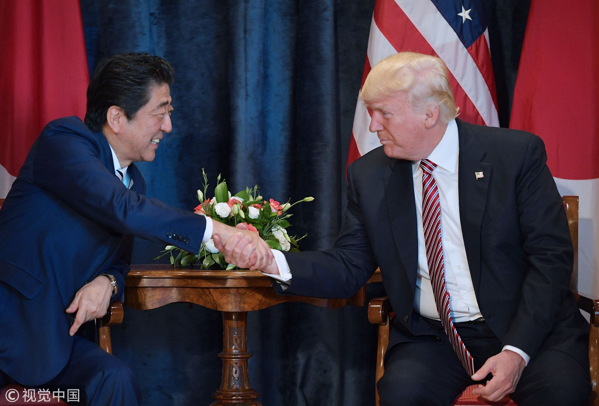 Japan's Prime Minister Shinzo Abe and US President Donald Trump shake hands before a meeting in the Oval Office of the White House in Washington, DC, on February 10, 2017. /VCG Photo.