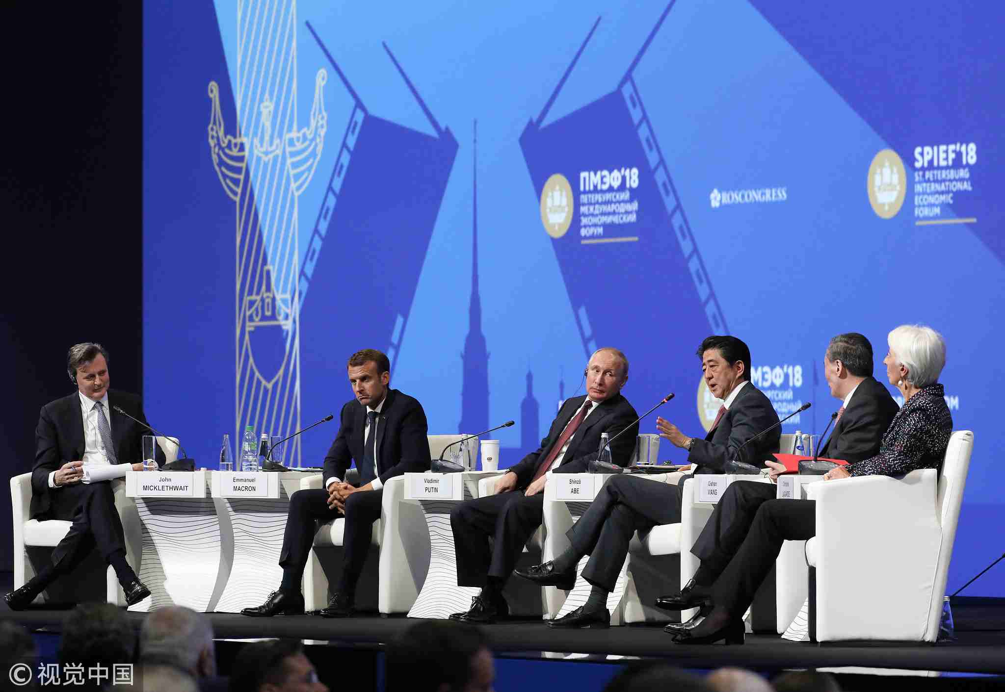 Abe attends the plenary session of the 2018 Saint Petersburg International Economic Forum in Saint Petersburg, Russia, on May 25, 2018. /VCG Photo.