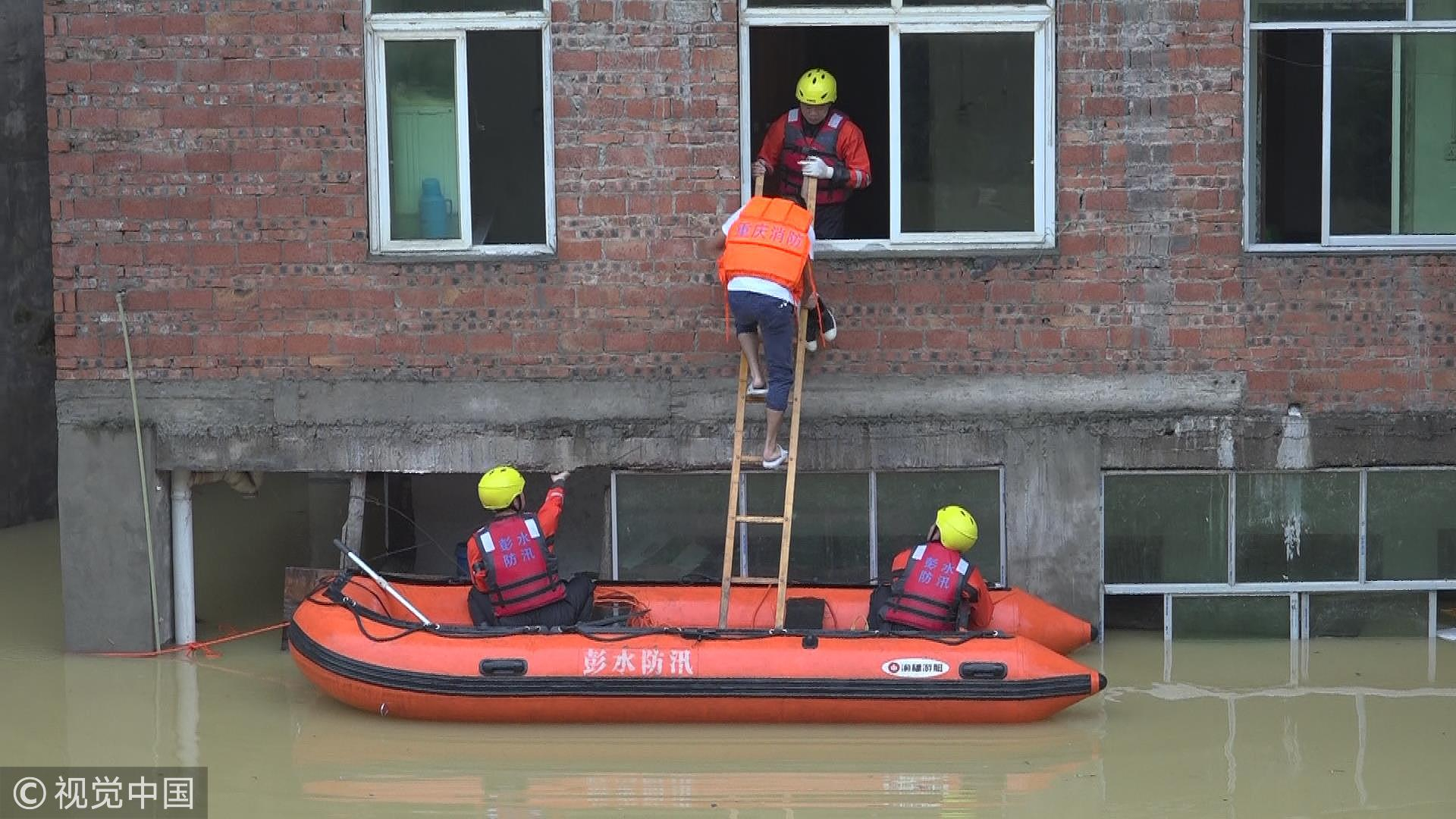 Firefighters put life jackets on stranded people and used a ladder to help them out of the building and board the raft. All people are safe now. /VCG Photo