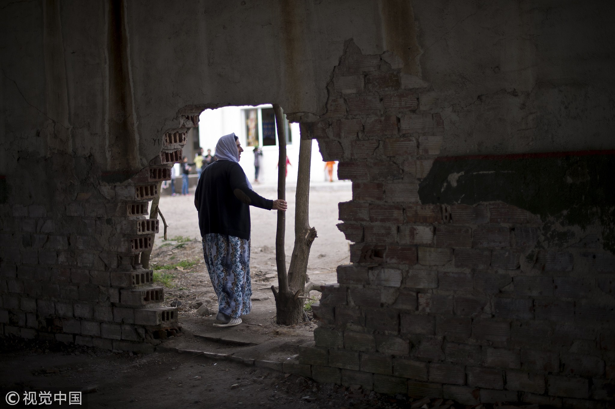 A Syrian woman stands near a hole in the wall of a building at Bulgaria's main Harmanli refugee camp in south-central Bulgaria, April 22, 2015. /VCG Photo