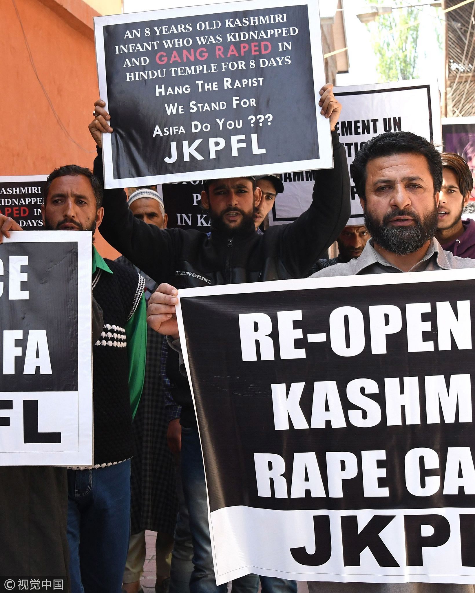 Indian Kashmiri protesters call for justice following the recent rape and murder case of an eight-year-old girl in the Indian state of Jammu and Kashmir, in Srinagar, April 23, 2018. /VCG Photo