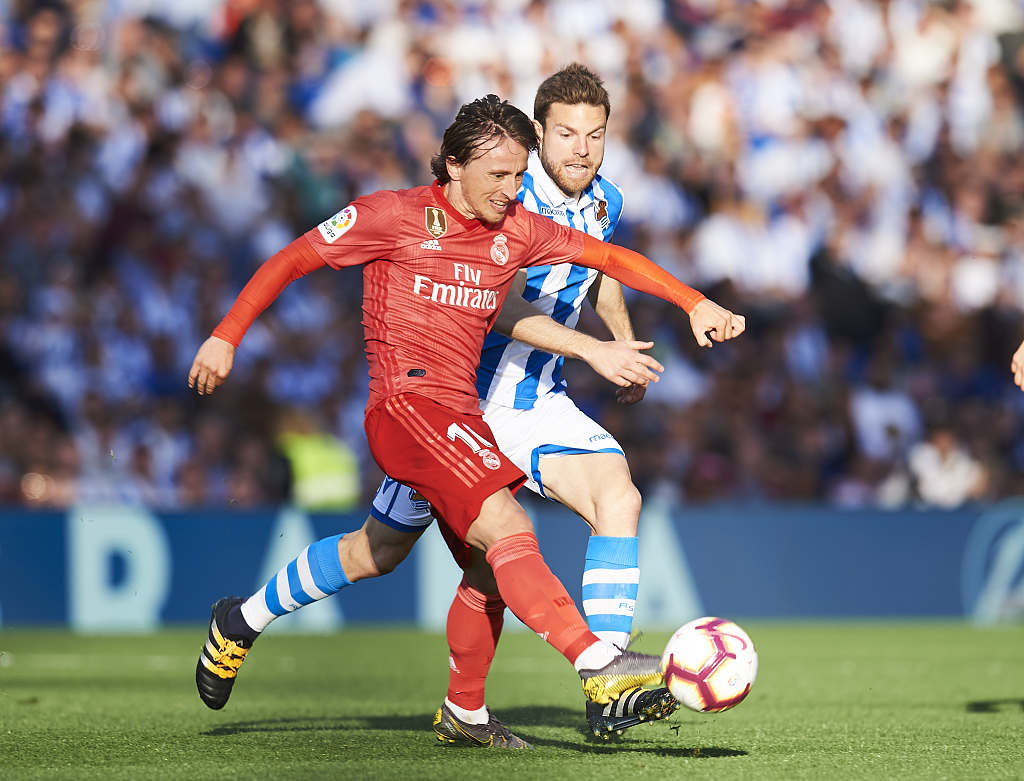 Luka Modric (front) of Real Madrid CF duels for the ball with Asier Illarramendi of Real Sociedad during the La Liga match at Estadio Anoeta in San Sebastian, Spain, May 12, 2019. /VCG Photo