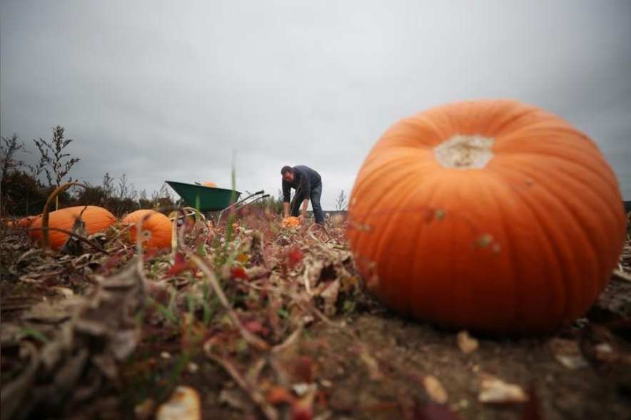 Charles Eckley inspects his pumpkin harvest in a field at Pumpkin Moon in Maidstone, Britain, October 14, 2018. /Reuters Photo