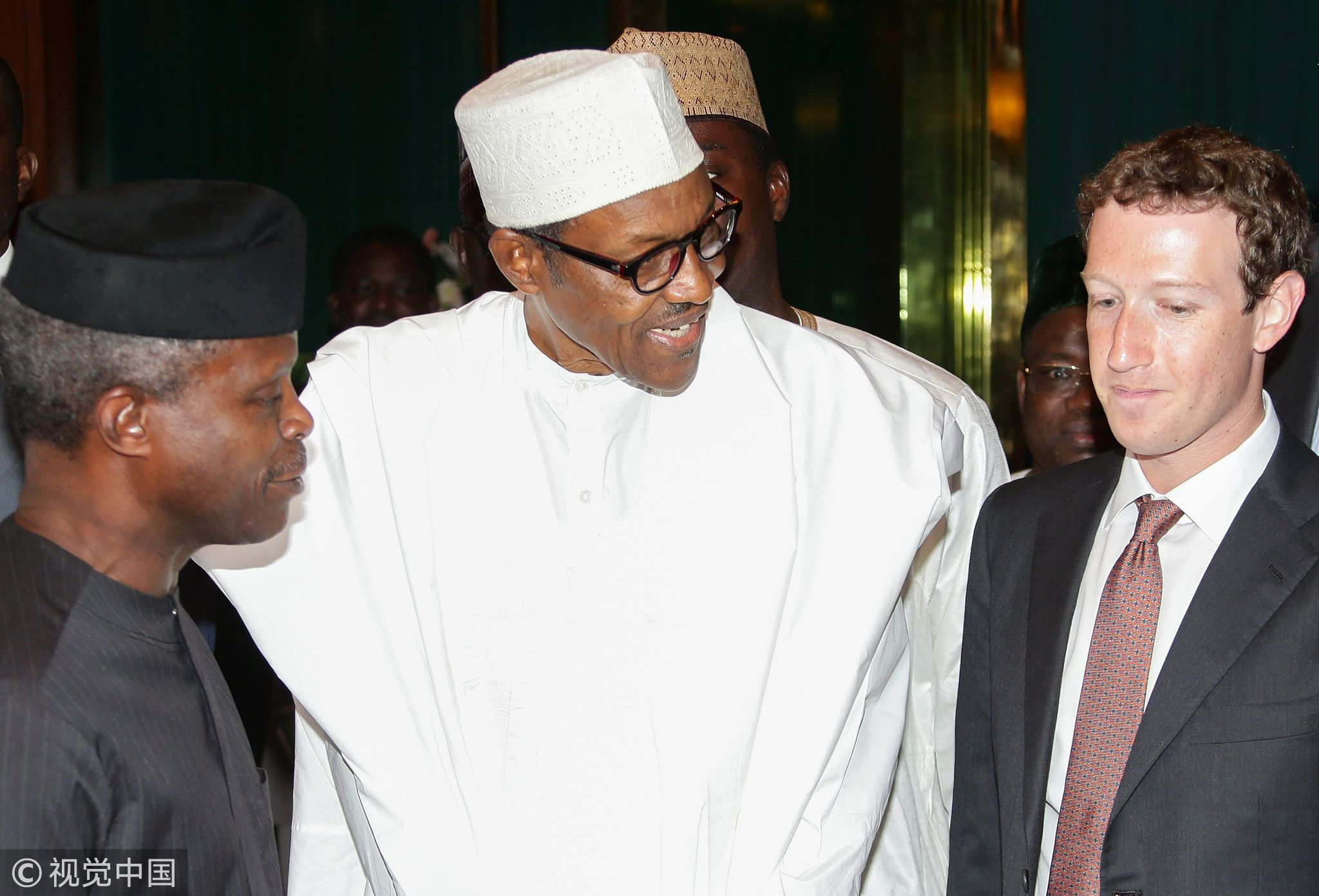 Nigerian President Muhammadu Buhari (C) and Vice President Yemi Osinbajo (L) talk with Facebook founder Mark Zuckerberg (R), during his visit to the presidential palace in Abuja, on September 2, 2016./VCG Photo