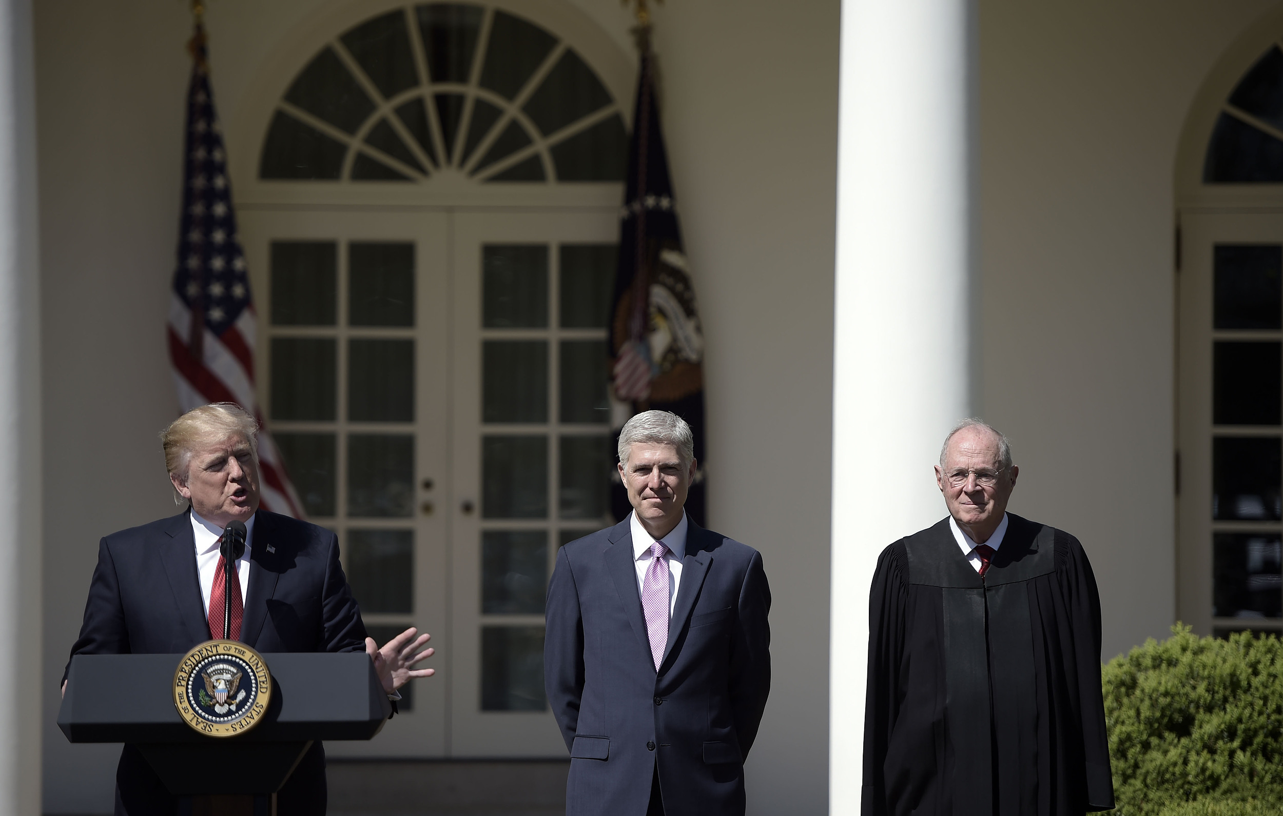 President Donald Trump speaks before Justice Anthony Kennedy (R) administers the oath of office to Neil Gorsuch (C) as an associate justice of the US Supreme Court in the Rose Garden of the White House, April 10, 2017, in Washington, DC. /VCG Photo