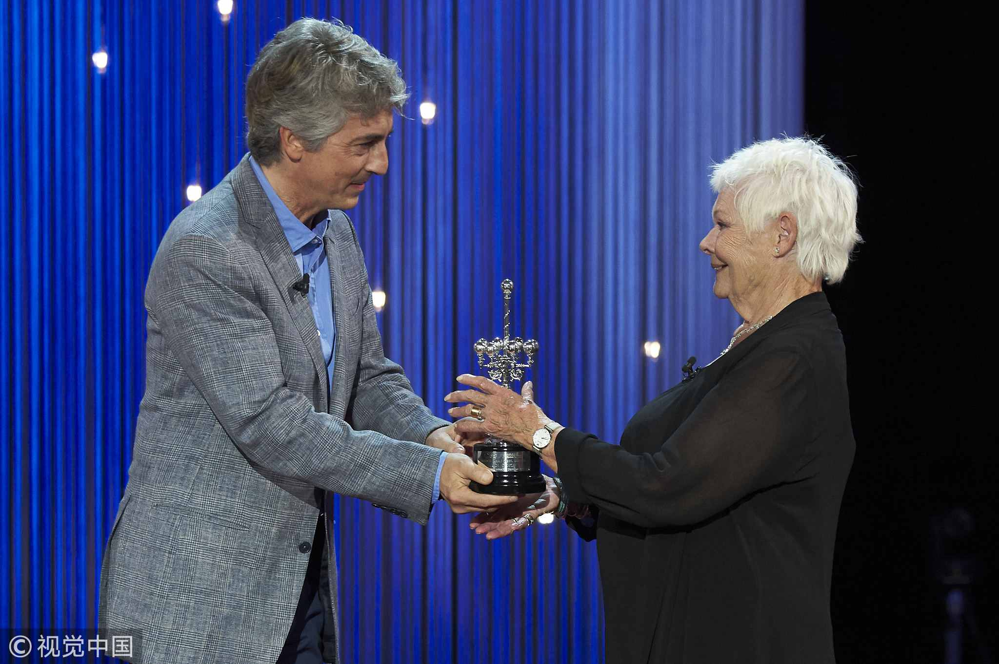 Actress Judi Dench receives the Donostia Award from President of Jury Alexander Payne during the 66th San Sebastian International Film Festival in Spain. /VCG Photo