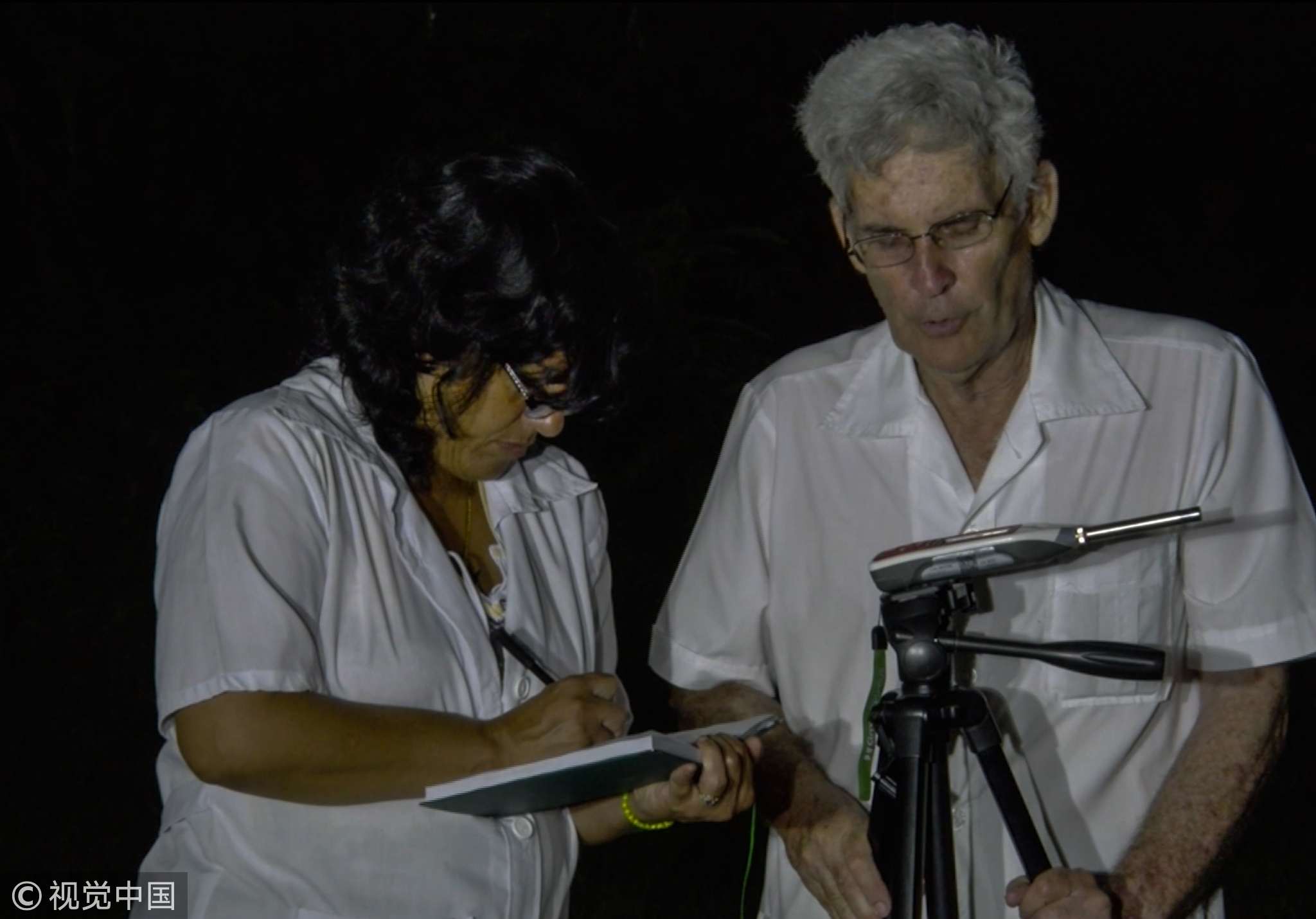TV grab taken on October 26, 2017 from a recent recording by Cuban Television showing environmentalists analyzing sounds in areas where officials from the US embassy in Havana were allegedly affected by mysterious attacks in the past months. /VCG Photo