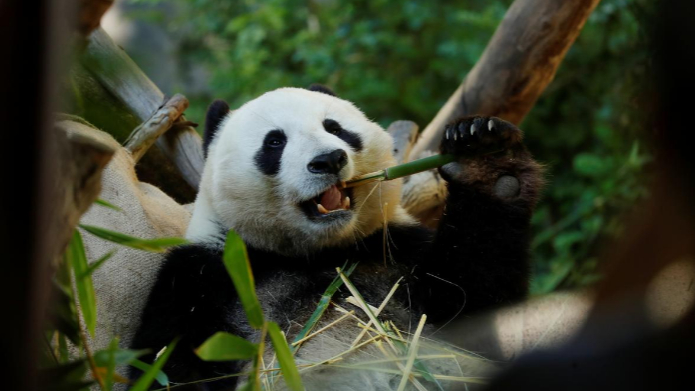 Giant panda Xiao Liwu eats a meal of bamboo. /Reuters Photo