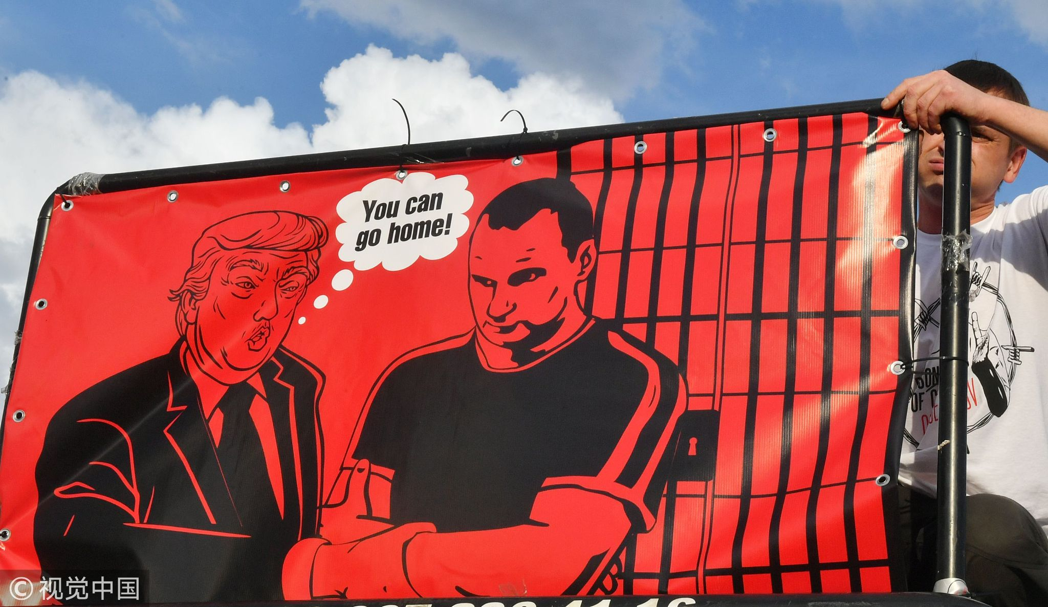An activist displays a banner depicting US President Donald Trump (L) saying to Oleg Sentsov, "You can go home!" during a rally at Independence Square in the Ukrainian capital of Kiev, marking Oleg Sentsov's birthday on July 13, 2018. /VCG Photo