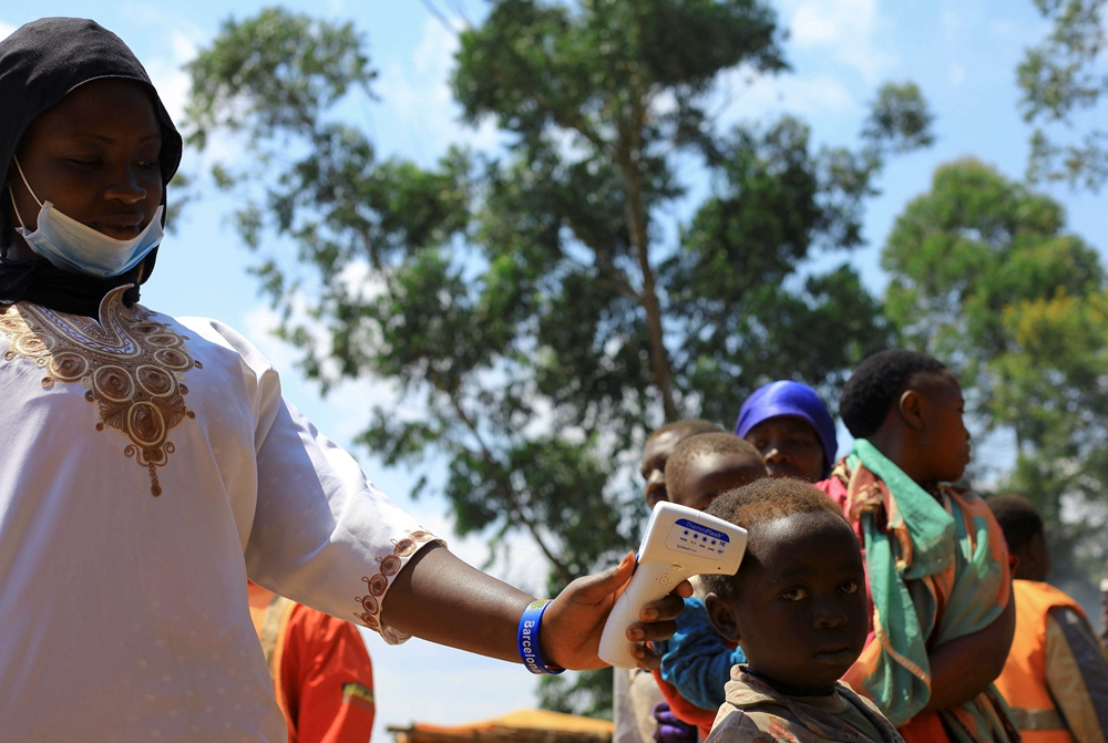 A Congolese health worker checks temperatures of children near Mangina village in North Kivu province of the Democratic Republic of Congo, August 8, 2018. /VCG Photo
