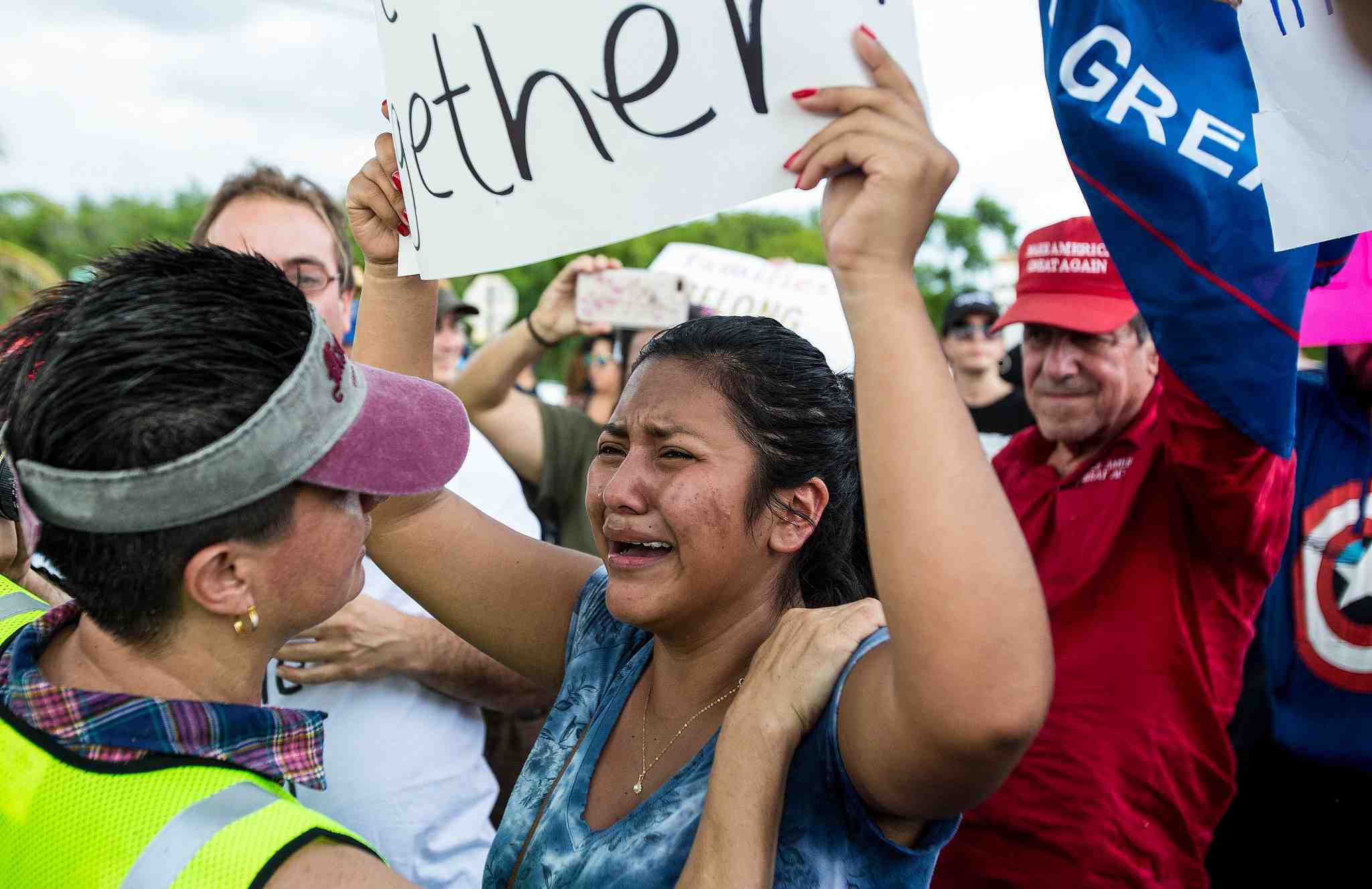 June 23, 2018: A demonstrator holding a sign confronts pro-Trump supporters during the "Keep Families Together" march outside of the Homestead temporary shelter for unaccompanied migrant children in Homestead, Florida. /VCG Photo