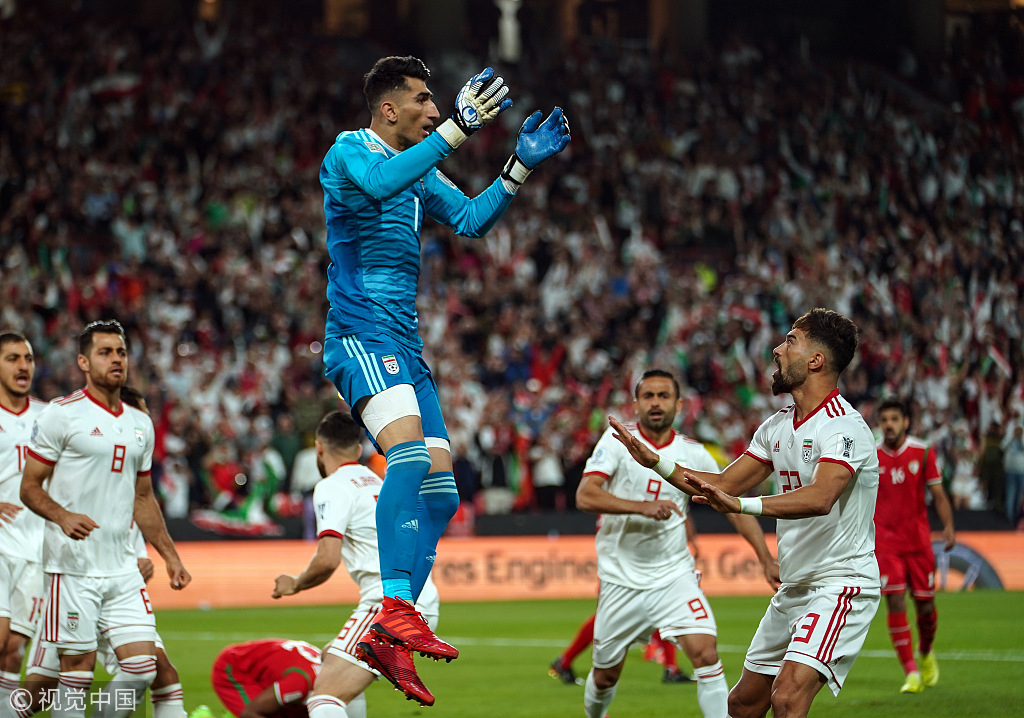 Alireza Beiranvand (C) of Iran saves a penalty from Ahmed Kano of Oman during the 2019 AFC Asian Cup round of 16 match between Iran and Oman at Zayed Sports City Stadium in Abu Dhabi, the United Arab Emirates, January 20, 2019. /VCG Photo