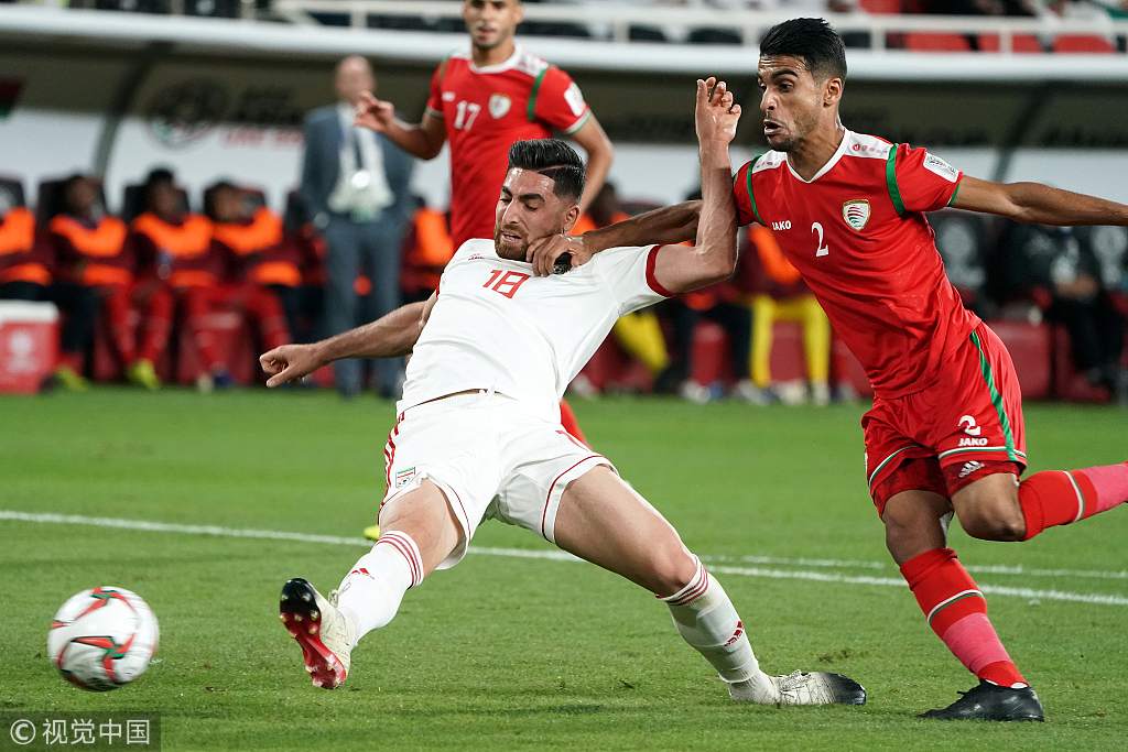 Alireza Jahanbakhsh (L) of Iran scores his side's first goal during the AFC Asian Cup round of 16 match between Iran and Oman at Zayed Stadium, January 20, 2019. /VCG Photo