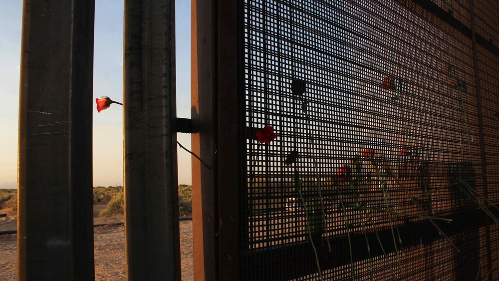 Flowers placed on a gate at the border between the US and Mexico during a protest against the new construction plan of about 34km of steel wall between Santa Teresa, New Mexico, and Ejido San Jeronimo, June 2, 2018. /VCG Photo