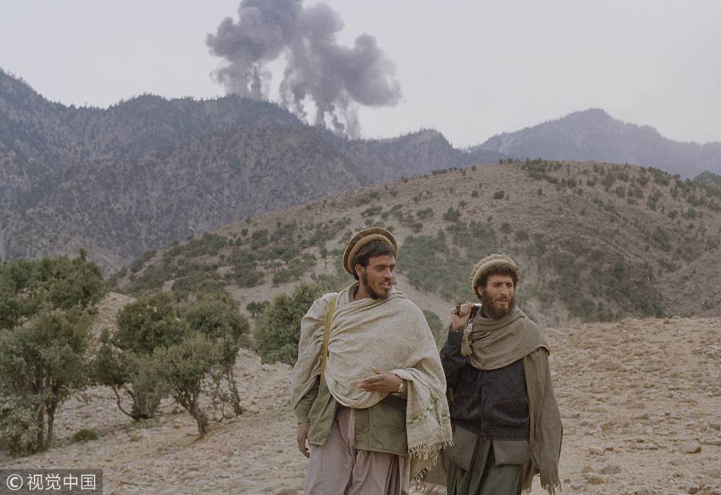 Afghan fighters from the Eastern Alliance walk on a path as American bombs are dropped on an Al Qaeda position, December 15, 2001, Tora Bora, Afghanistan. /VCG Photo