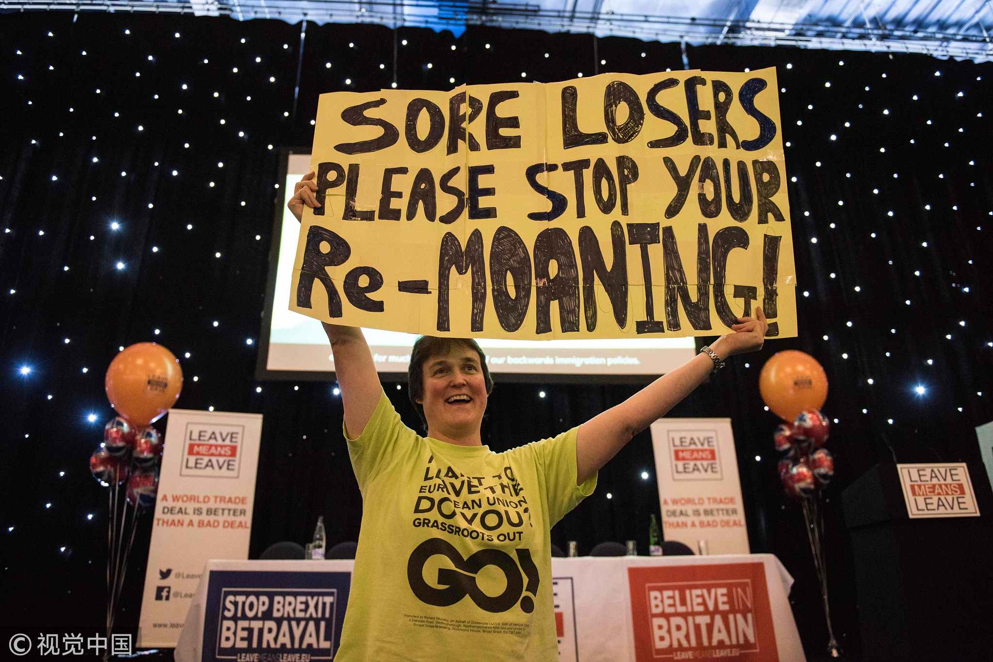 A pro-Brexit campaigner holds up a placard in front of the stage prior to the 'Save Brexit' rally organized by the Leave Means Leave campaign in Bolton, northwest England on September 22, 2018. /VCG Photo