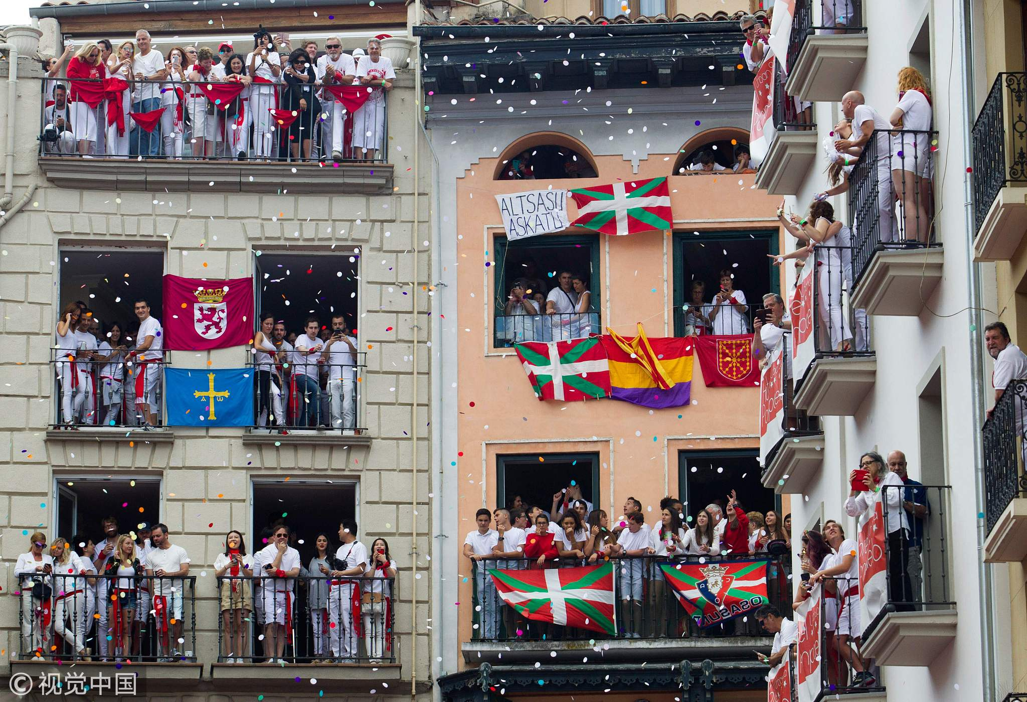 Participants celebrate during the "Chupinazo" (start rocket) to mark the kickoff of the San Fermin Festival in Pamplona, Spain, July 6, 2018. /VCG Photo